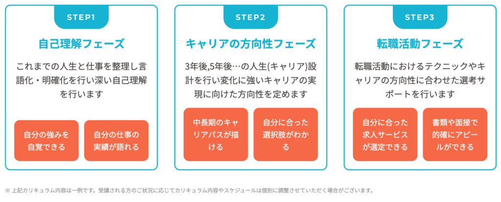 転職エージェント業で年間3000名の転職支援経験に基づき、作成したカリキュラムを使用し、20〜40代の経験豊富なコーチがコーチングを担当します。